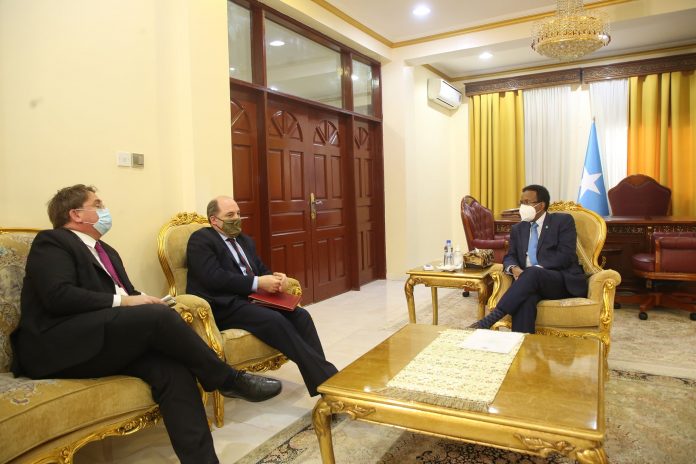 Muqdusho, Jannaayo 27, 2021: Madaxweynaha Jamhuuriyadda Federaalka Soomaaliya Mudane Maxamed Cabdullaahi Farmaajo ayaa Madaxtooyada Qaranka ku qaabilay Wasiirka Difaaca Boqortooyada Ingiriiska Mudane Ben Wallace oo uu wehelinayay Safiirka Ingriiska ee Soomaaliya Mudane Ben Fender.