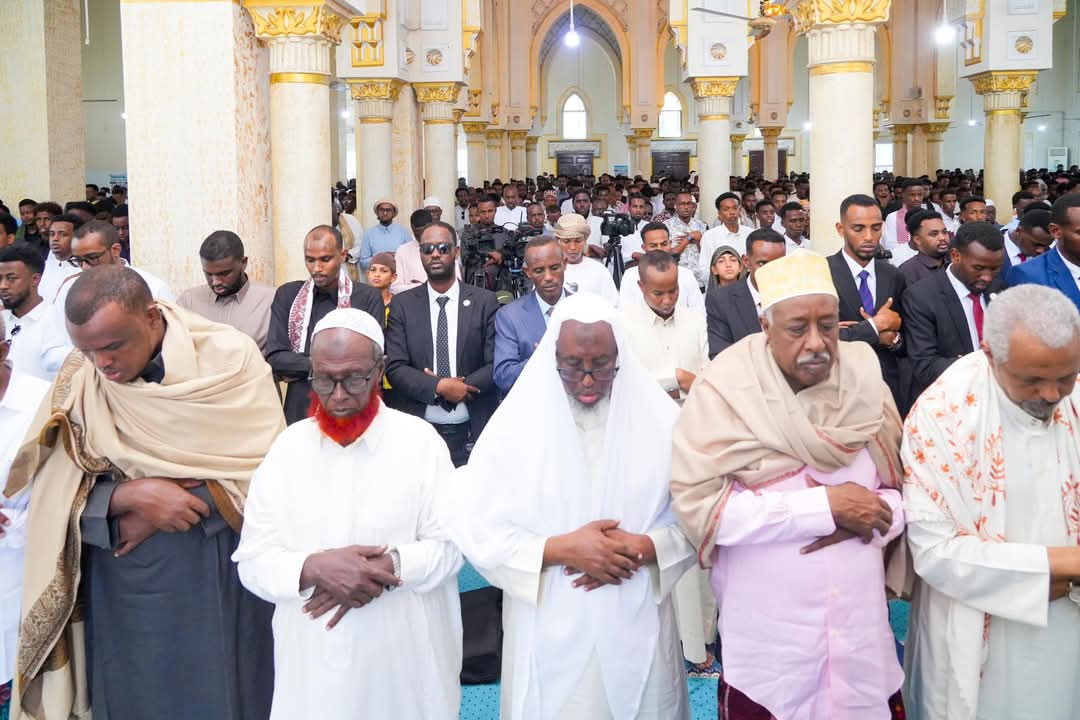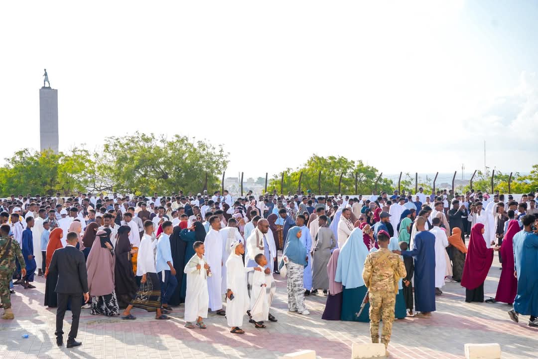 Madaxweynaha Jamhuuriyadda Federaalka Soomaaliya Mudane Xasan Sheekh Maxamuud ayaa Masaajidka Isbahaysiga Islaamka kula oogay Salaadda Ciiddul Fidriga, Kumannaan ka mid ah shacabka Soomaaliyeed, masuuliyiinta hay’adaha iyo howlwadeennnada dowladda.