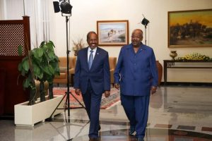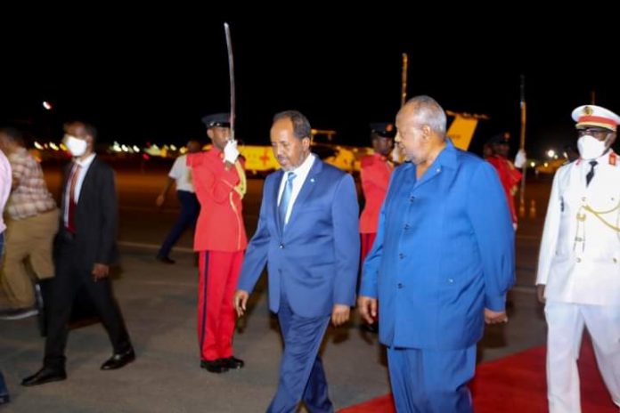 Jabuuti, Oktoobar 22, 2022: Madaxweynaha Jamhuuriyadda Federaalka Soomaaliya Mudane Xasan Sheekh Maxamuud iyo wafdi uu hoggaaminayo oo safar shaqo ku gaaray dalka aan walaalaha nahay ee Jabuuti ayaa waxaa si diirran ugu soo dhaweeyey garoonka diyaradaha Ambouli International Airport Madaxweynaha Jamhuuriydda Jabuuti, mudane Ismaaciil Cumar Geelle.